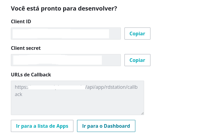 Após finalizar a criação do aplicativo, o RD Station exibirá o Client ID e o Client Secret. Copie esses dados e insira na Uappi seguindo o caminho: Apps > RD Station > Configurações