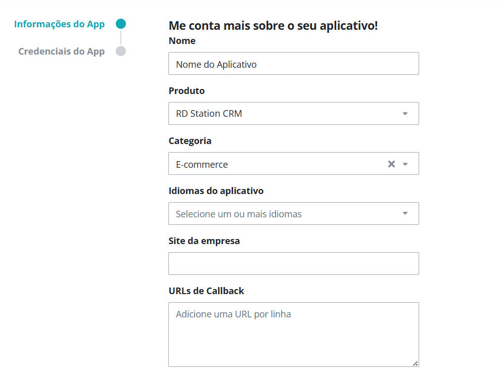 Durante a criação do app, a ferramenta solicitará uma URL de callback. Para isso, adicione /api/app/rdstation/callback ao final da sua URL principal.