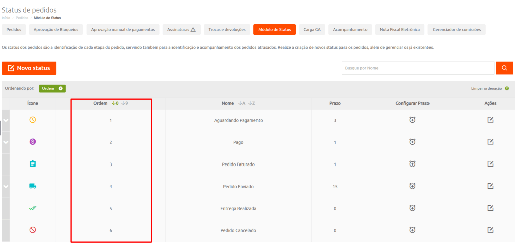 Além de organizar o fluxo, os status também ajudam a identificar e acompanhar pedidos atrasados.