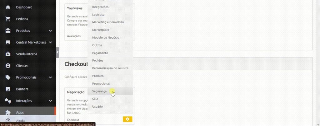 No painel da Uappi, siga o caminho: Apps > Segurança > Recaptcha. Ou, se preferir: Configurações > Integrações > Recaptcha.