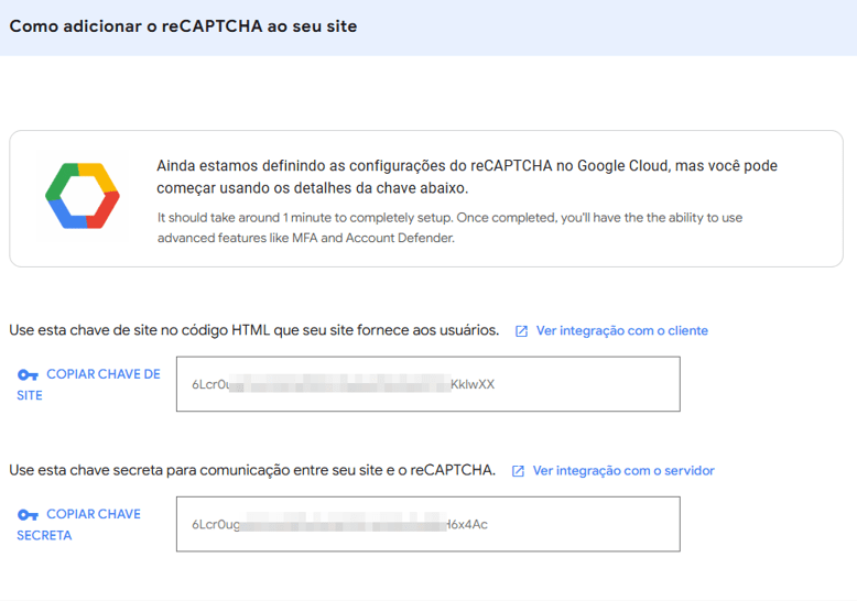 Dica: certifique-se de colar as chaves, exatamente como foram geradas pelo Google, sem espaços ou alterações.